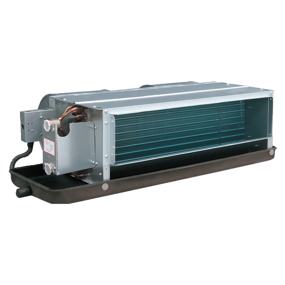 Особенности и преимущества: монтаж подпотолочный или околопотолочный, различные варианты внешнего статического давления, четырехтрубный с четырёхрядным теплообменником, материал теплообменника – бесшовные медные трубки и алюминиевые ребра с гидрофильным покрытием, низкий уровень шума, вентилятор – центробежный с загнутыми вперед лопатками, конденсаторный двигатель.